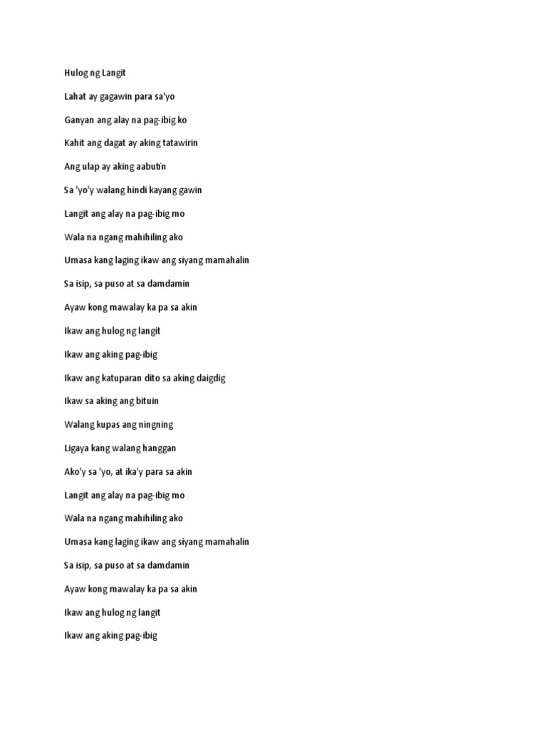 Anong uri ng tayutay ang siya ay hulog ng langit - Brainlyph. Ang ulap ay aking aabutin Sa yoy walang hindi kayang gawin Langit ang alay na pag-ibig mo Wala na ngang mahihiling ako Umasa kang laging ikaw ang syang mamahalin. Human translations with examples.