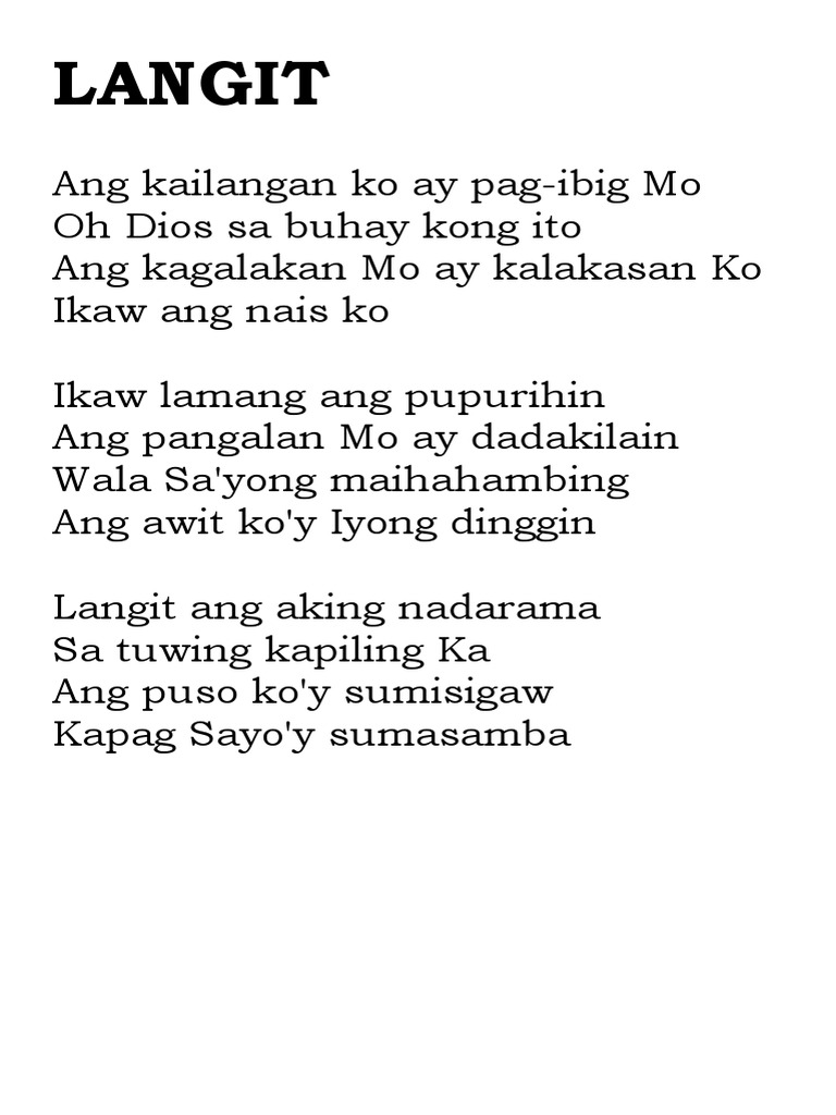Langit Ang buhay sa tuwing ikay hahagkan anong ligaya sa tuwing ikay mamasdan. Ikaw ang pag-asang tanglaw sa dilim. Langit ang buhay sa tuwing ikay hahagkan Anong ligaya sa tuwing ikay mamasdan Sa piling mo ang gabiy tila araw Ikaw ang pangarap Ikaw lamang Ikaw ang pag-ibig Sa araw at gabi Ikaw ang pag-asang tanglaw sa dilim Napapawit hirap at pighati Langit ang buhay sa tuwing ikay hahagkan Anong ligaya sa tuwing ikay mamasdan Sa piling mo ang gabiy tila araw.